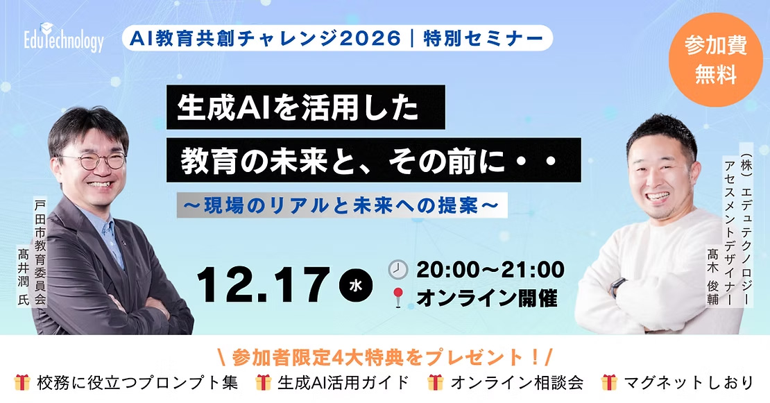 エデュテクノロジーは、「AI教育共創チャレンジ2026」特別セミナー「生成AIを活用した教育の未来と、その前に・・ 〜現場のリアルと未来への提案~」を 12月17日にオンラインで開催する。