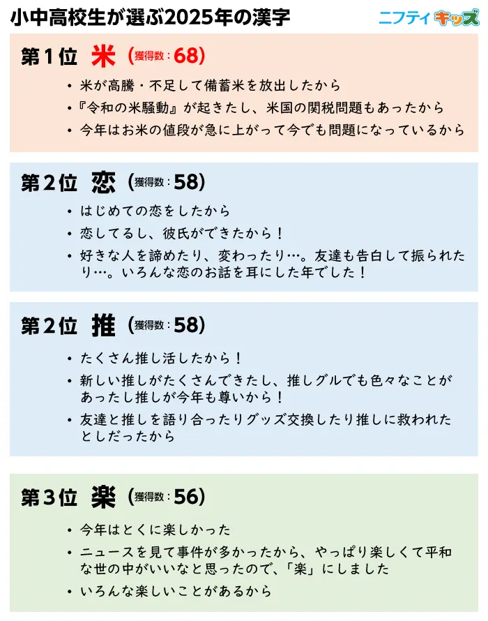 小中高校生が選ぶ2025年の漢字1位は「米」、「恋」「推」が続く =「ニフティキッズ」調べ=