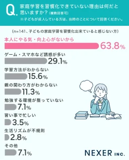 「家庭学習を習慣化できていない理由」については、「本人のやる気・向上心がないから」が最多の63.8%。次いで「ゲーム・スマホなどの誘惑が多い」が29.1%だった。
