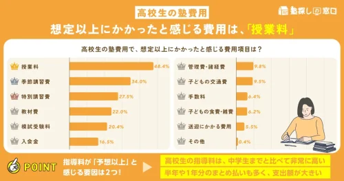 高校生の塾費用で「想定以上にかかった」と保護者が感じる項目は授業料=塾探しの窓口調べ=