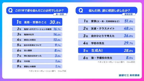 調査は、進研ゼミ高校講座「StudyCast」および「Study NEWS ! 進研ゼミ」の利用者を対象に11月5日~15日に行われ、高校1~3年生756名から回答を得た。それによると、高校生の悩み1位は「進路・受験のこと」で、相談相手は家族が最多だったが、生成AIへも約3割が相談すると回答した。