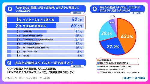 わからない問題の対処法では「デジタル・AIで調べる」が6割超(ネット検索67.2%、AI活用63.6%)を占めた。また、この1年で「学習へのデジタル・AI活用が増えた」と答えた高校生は約7割に上った。学習への生成AI活用については、約9割の高校生が経験ありと回答、活用が定着傾向にあることが窺えた。