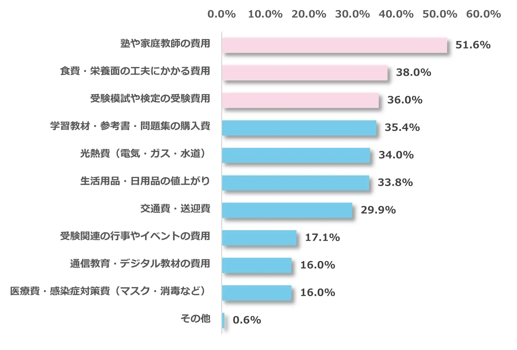 「影響のあった具体的な項目」を聞いたところ、最も多かったのは「塾や家庭教師の費用」51.6%で、以下、「食費・栄養面の工夫にかかる費用」38.0%、「受験模試や検定の受験費用」36.0%と続いた。ほかにも、「教材購入費」35.4%や「光熱費」34.0%、「日用品」33.8%、「交通・送迎費」29.9%など、多岐にわたる項目で影響がみられた。