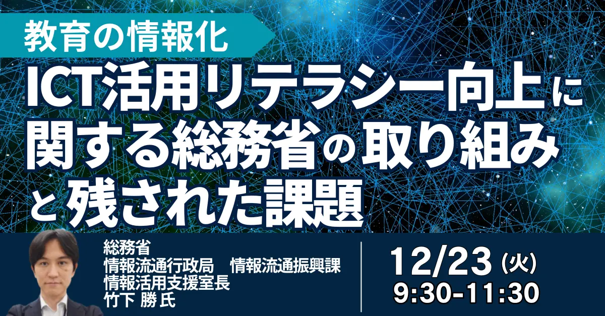 セミナーでは、総務省 情報流通行政局 情報流通振興課 情報活用支援室長の竹下勝氏を迎え、ICTの利活用が当たり前となった環境下での健全なデジタル空間の実現などに向け、同室が行っている教育分野におけるデータ利活用に係る取り組みや、ICTリテラシー向上を目的とした官民連携での意識啓発プロジェクト「DIGITAL POSITIVE ACTION」の推進、さらに、幅広い世代を対象としたICTリテラシー向上に資する取り組みを中心に説明する。