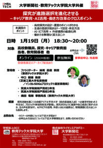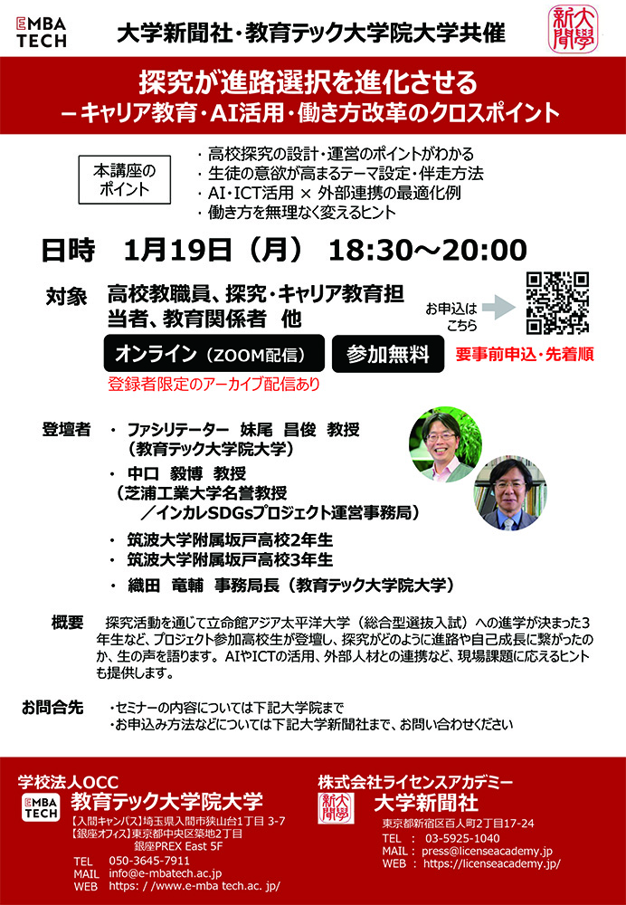 大学新聞社と教育テック大学院大学は、教育関係者を対象としたオンラインセミナー「探究が進路選択を進化させる ~キャリア教育・AI活用・働き方改革のクロスポイント~」を2026年1月19日に共同開催する。