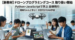 同教材は、プログラミング初心者から中高生の探究学習まで対応した STEAM教育向けカリキュラムで、クラウド環境上で Blockly/Python/JavaScript の3種類のプログラミングを学びながら、自律飛行制御を包括的に習得できる。