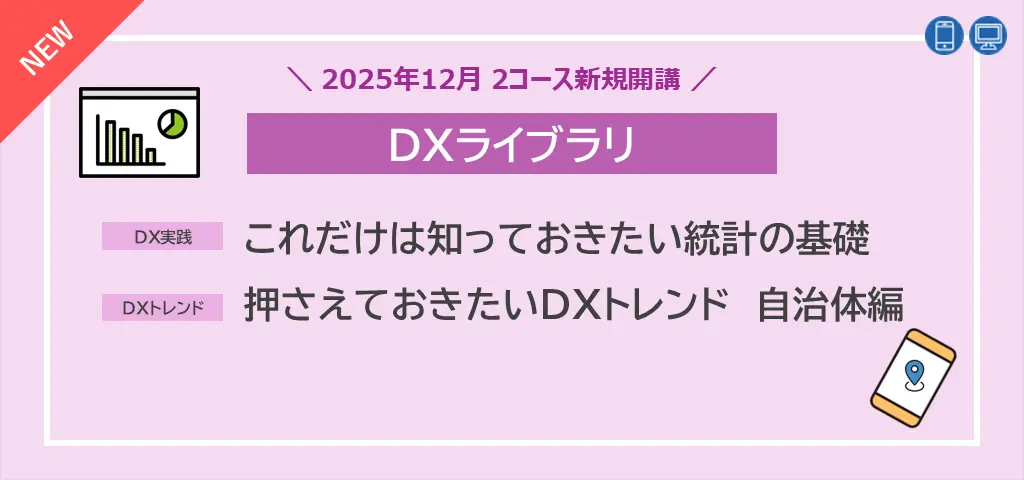 「eラーニングライブラリ」は、マルチデバイスに対応し、オンラインで、いつでも何度でも、手軽に学ぶことができる法人向け教育ツール。開講した2コースは、「これだけは知っておきたい統計の基礎」と「押さえておきたいDXトレンド 自治体編」。