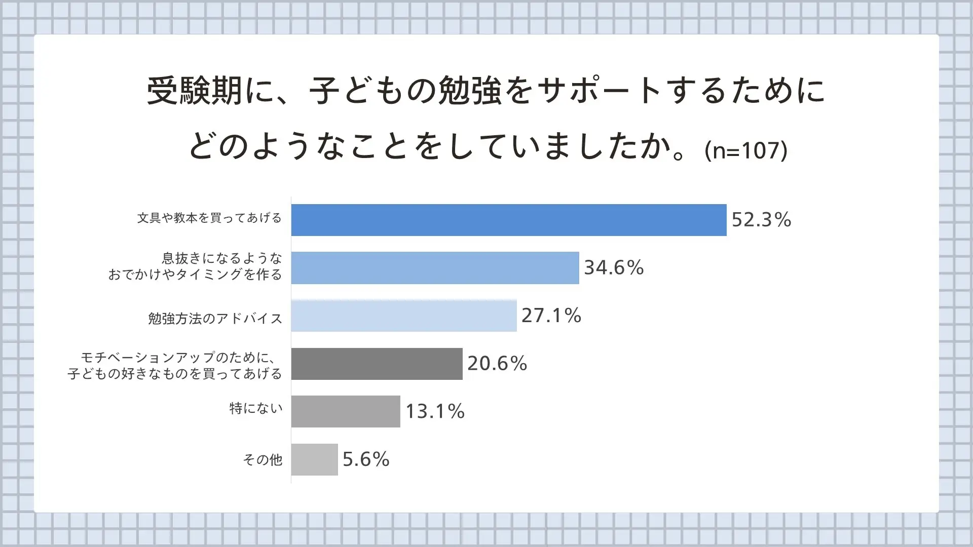 さらに、「受験期に、子どもの勉強をサポートするためにどのようなことをしていたか?」との質問では、半数を超える52.3%が「文具や教本を買ってあげる」と回答した。過去問や教本の復習・反復演習で文具の消費が多くなる受験期こそ、会話や息抜きタイミングの提供にくわえて、文具や教本などモノを通じたコミュニケーションを行っていたことが分かった。