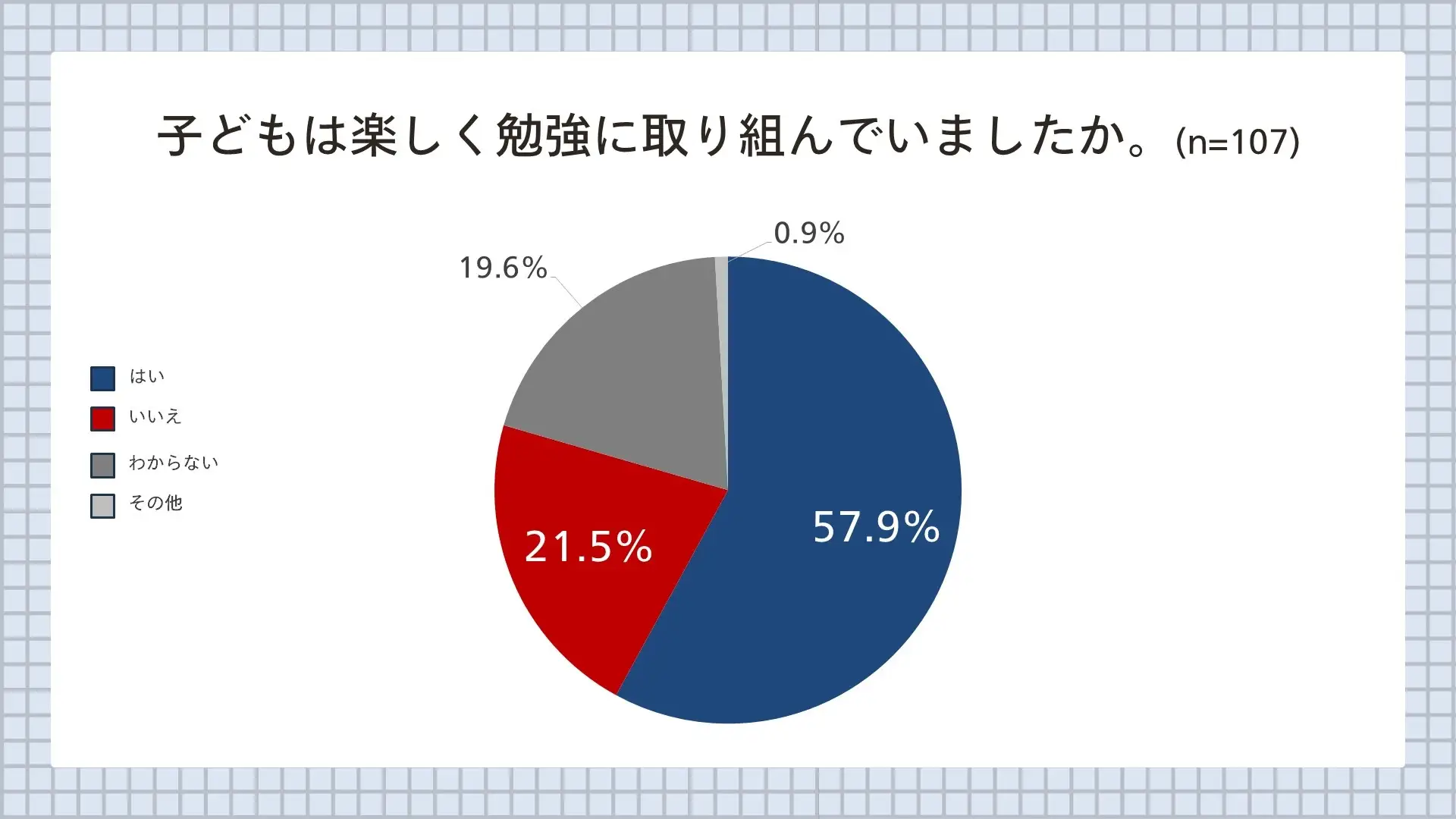 また、今回の調査では、57.9%の保護者が「子どもは楽しく勉強に取り組んでいた」と回答。学習に前向きに取り組む子どもが多いという傾向が見られた。
