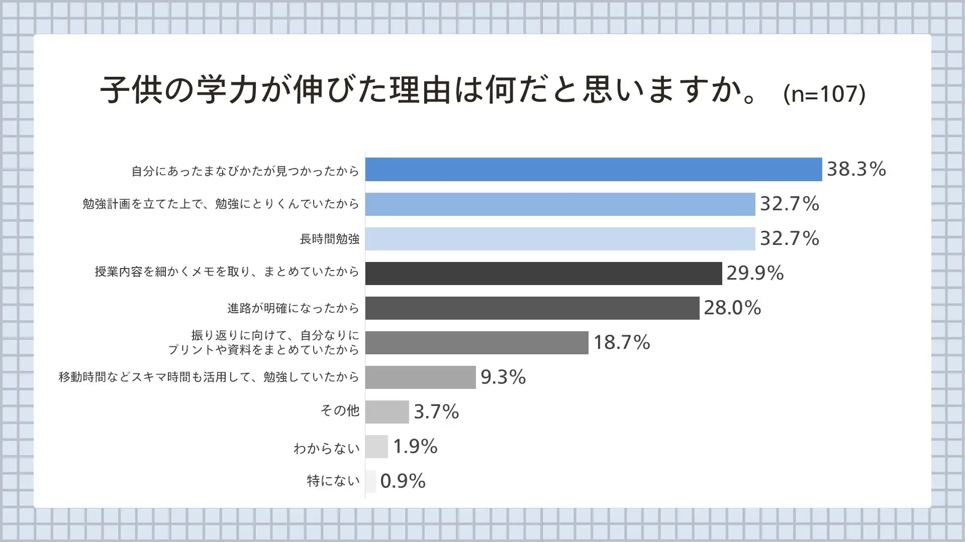 さらに、「子どもの学力が伸びた一番の理由」を聞いたところ、最多の回答は「自分にあった学び方が見つかったから」38.3%だった。自分にあった「学び方」を見つけ、楽しく勉強することが、合格につながっていることが伺えた。