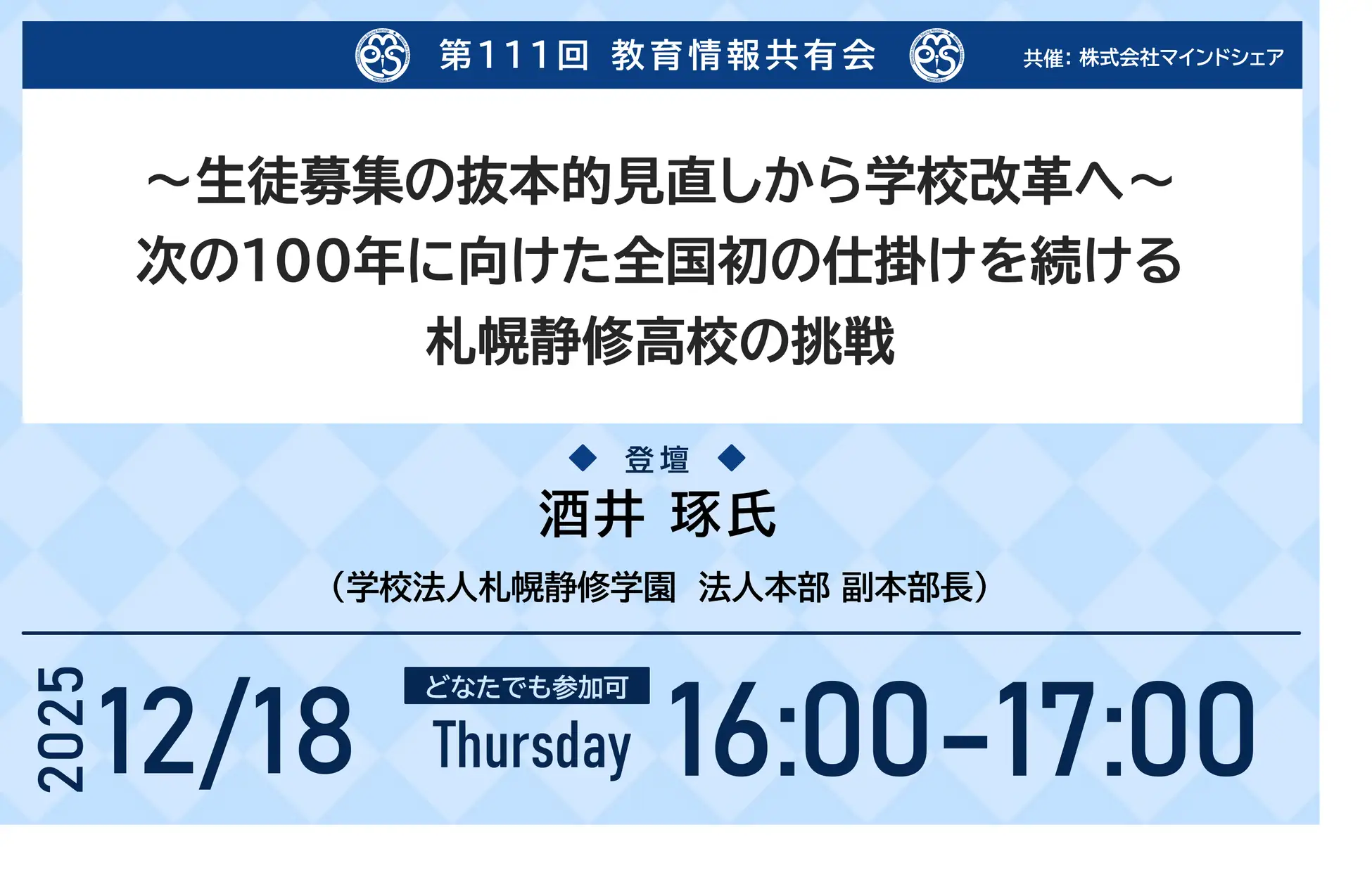 マインドシェアは、「~生徒募集の抜本的見直しから学校改革へ~次の100年に向けた全国初の仕掛けを続ける札幌静修高校の挑戦」をテーマにした、第111回「教育情報共有会」を、12月18日にオンラインで無料開催する。