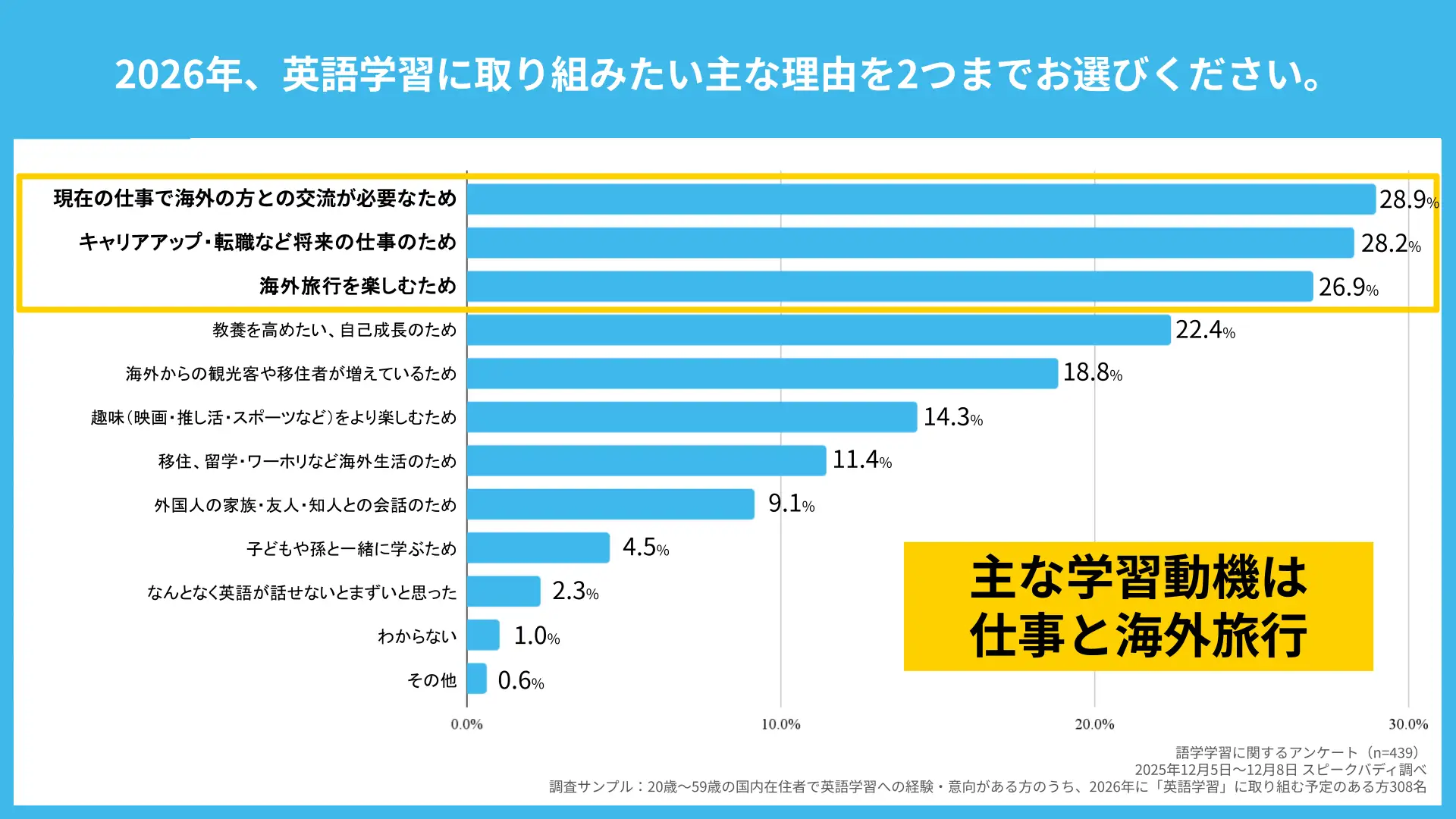 2026年に英語学習に取り組む目的(複数回答)としては、「現在の仕事で海外の方との交流が必要なため」(28.9%)、「キャリアアップ・転職など将来の仕事のため」(28.2%)、「海外旅行を楽しむため」(26.9%)が上位に挙げられた。
