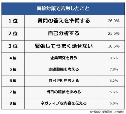 結果によると、面接対策で最も苦労したことの1位は「質問の答えを準備する」(26.0%)。僅差で2位が「自己分析する」(23.6%)となり、想定質問への回答づくりや自己理解の言語化など、事前準備に負担を感じる層が多いことが示された。3位には「緊張してうまく話せない」が入り、準備をしていても本番で頭が真っ白になる、早口になるといった”当日の壁”も課題として浮かび上がった。続いて4位は「企業研究を行う」、5位は「志望動機を考える」。異業種転職や情報が少ない企業の場合、深掘りが難しく、説得力のある動機につなげにくいという声も紹介されている。