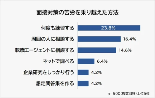 また、苦労を乗り越えた方法の最多は「何度も練習する」(23.8%)で、家族や友人に協力してもらった模擬面接など、反復練習による改善が有効とされた。