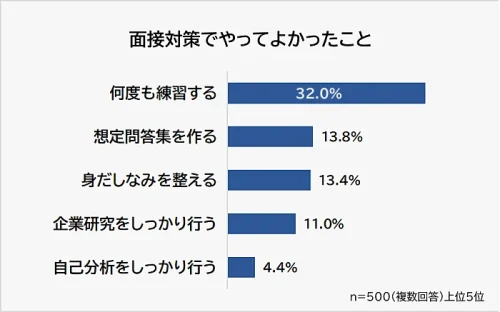 「面接対策でやってよかったこと」でも1位は同じく「何度も練習する」(32.0%)となり、想定問答集の作成や企業研究とあわせ、準備とリハーサルが面接の成果を左右するという傾向が確認できる。