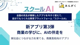 同シリーズは、スクールAI上で利用できる多様なアプリの中から、学校現場ですぐに活用できるものを厳選して紹介する取り組み。第3弾では、商業教育で求められる実践的なビジネススキルの育成や、探究的な学び、就職準備までを一体的に支援するアプリ群を展開し、生成AIが学びのプロセスに寄り添う教育環境を全国の商業高校に届ける。