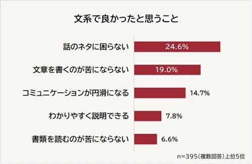 文系で良かったと思うことの1位は「話のネタに困らない(24.6%)」だった。2位「文章を書くのが苦にならない(19.0%)」、3位「コミュニケーションが円滑になる(14.7%)」と答えた人も多くなっている。