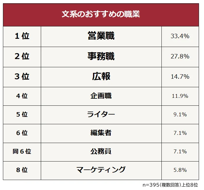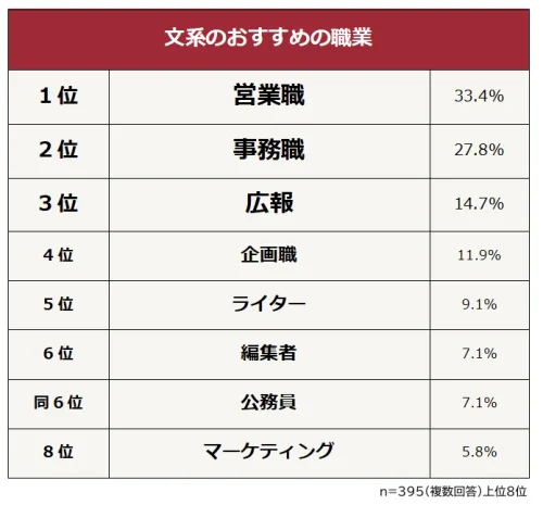それによると、「文系におすすめの職業」を聞いたところ、1位は「営業職(33.4%)」。2位「事務職(27.8%)」、3位「広報(14.7%)」、4位「企画職(11.9%)」と続いた。