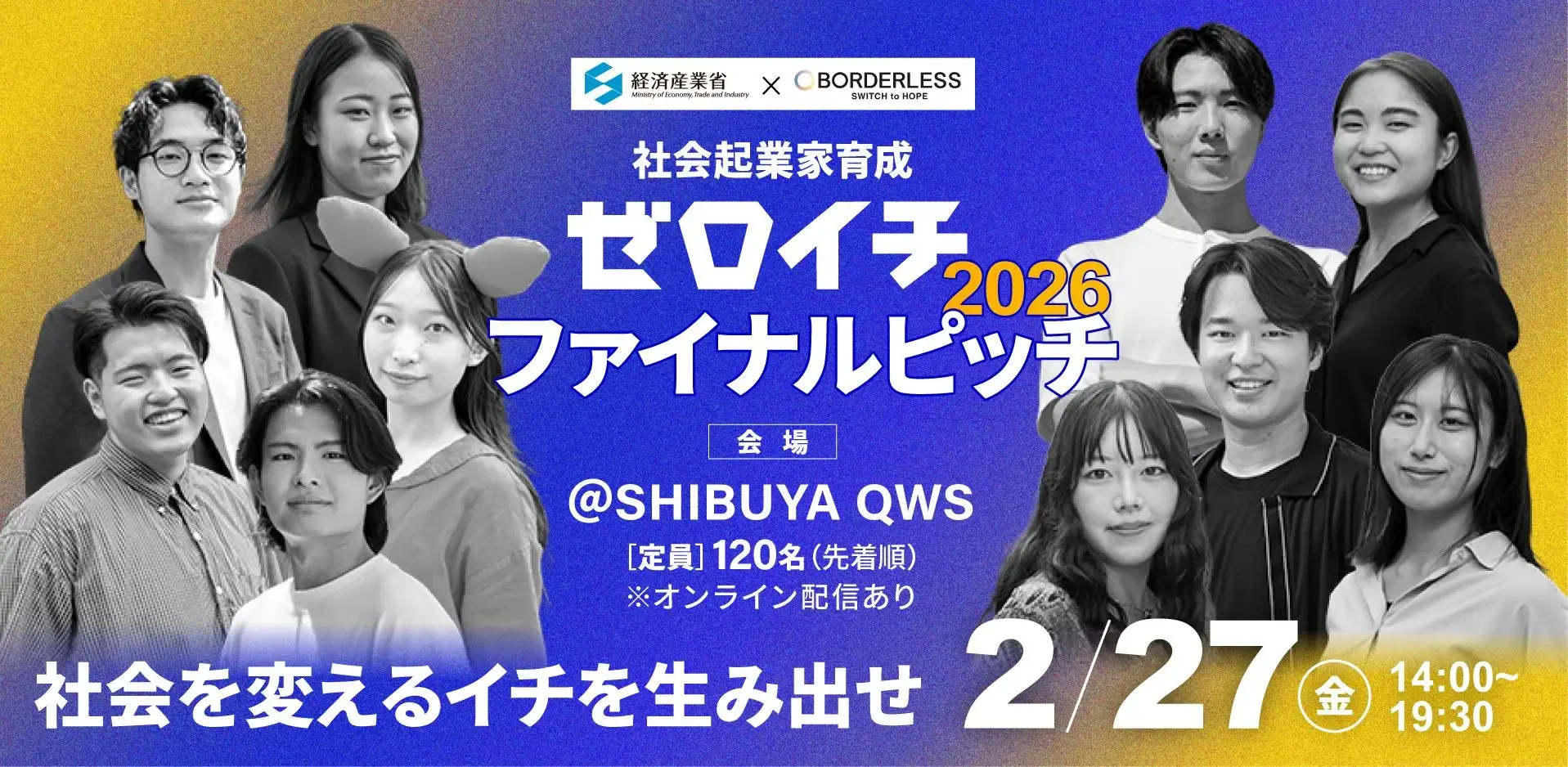 ボーダレス・ジャパンは、経済産業省の学生向け社会起業家アクセラレーションプログラム「ゼロイチ」第3期生の最終報告会「ゼロイチファイナルピッチ2026」を2026年2月27日に開催する。