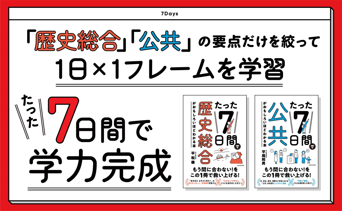 KADOKAWAは19日、共通テスト“直前対策”参考書「たった7日間で歴史総合がおもしろいほどわかる本」と、「たった7日間で公共がおもしろいほどわかる本」を発売した。
