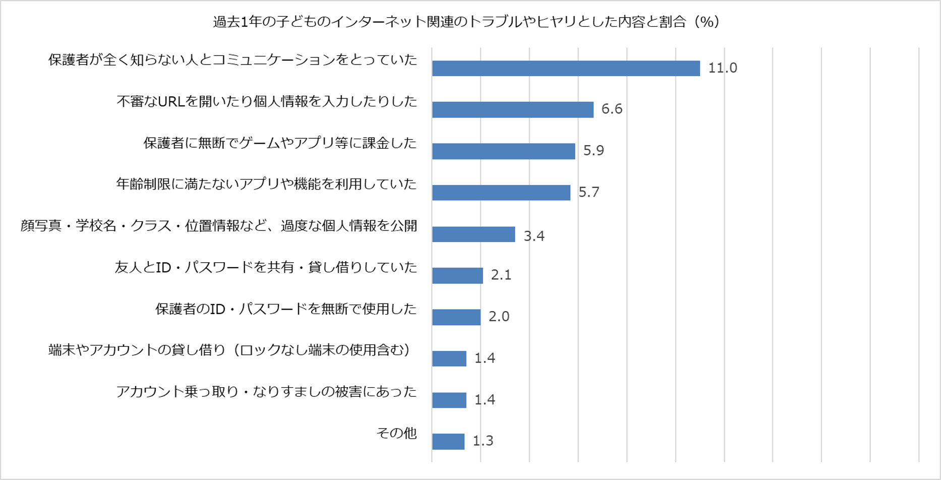 同調査では、直近1年(2024年12月~2025年11月)に保護者の28.4%が、子どものネット関連トラブルや「ヒヤリ」経験があったと回答。内容は「保護者が知らない人とコミュニケーションをとっていた」(11.0%)、「不審なURLを開いた/個人情報を入力した」(6.6%)、「無断課金」(5.9%)などが上位だった。