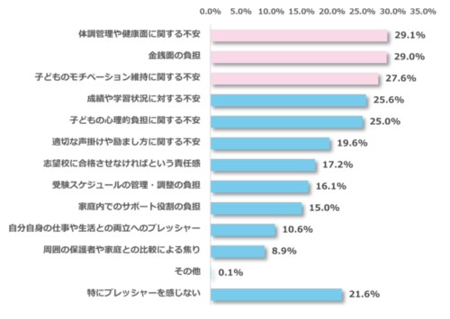 それによると、受験期に感じる「親としてのプレッシャー」について、最多回答は「体調管理や健康面に関する不安(29.1%)」、次いで「金銭面の負担(29.0%)」、「子どものモチベーション維持に関する不安(27.6%)」と続いた。