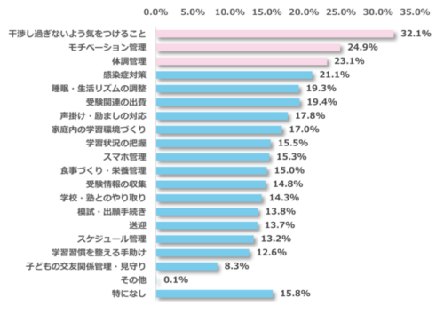 受験をサポートする中で、特に負担に感じることについては、最多回答は「干渉し過ぎないよう気をつけること(32.1%)」、次いで「モチベーション管理(24.9%)」、「体調管理(23.1%)」となった。