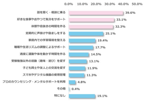 受験勉強中のメンタルケアとして実践していることについては、最多回答は「話を聞く・相談に乗る(39.6%)」、次いで「好きな食事やおやつで気分をサポート(33.1%)」、「休憩や息抜きの時間を作る(32.3%)」となった。