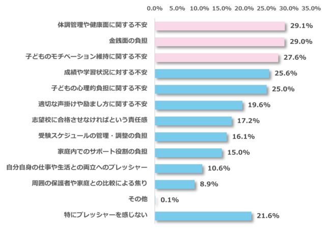 それによると、受験期に感じる「親としてのプレッシャー」について、最多回答は「体調管理や健康面に関する不安(29.1%)」、次いで「金銭面の負担(29.0%)」、「子どものモチベーション維持に関する不安(27.6%)」と続いた。