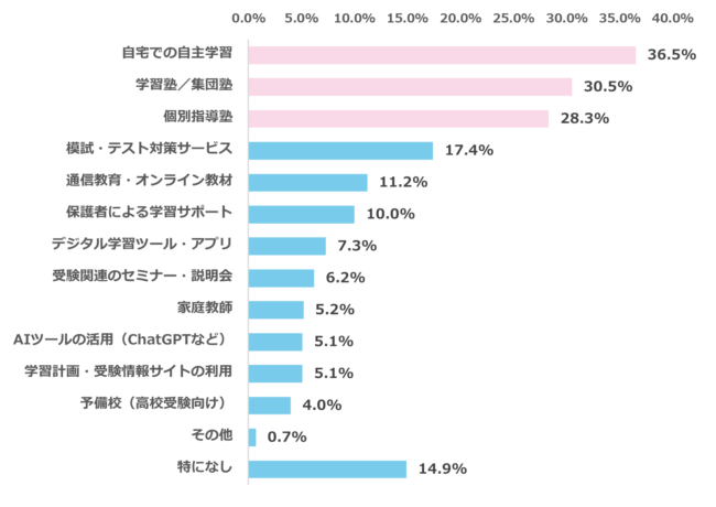 受験対策のために、利用している主なサービスや手段については、最多回答は「自宅での自主学習(36.5%)」、次いで「学習塾/集団塾(30.5%)」、「個別指導塾(28.3%)」と続いた。
