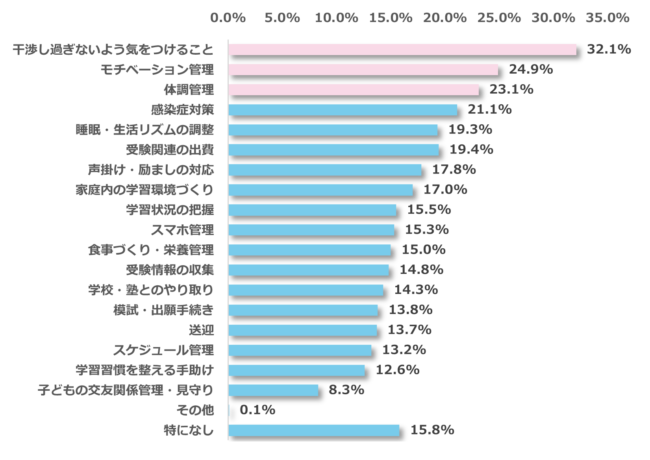 受験をサポートする中で、特に負担に感じることについては、最多回答は「干渉し過ぎないよう気をつけること(32.1%)」、次いで「モチベーション管理(24.9%)」、「体調管理(23.1%)」となった。