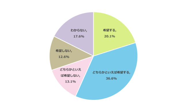 公立高校を志望する中学3年生の保護者732名に、デジタル併願制の導入について調査したところ、56.7%が「希望する」(希望する:20.1%、どちらかといえば希望する:36.6%)と回答した。