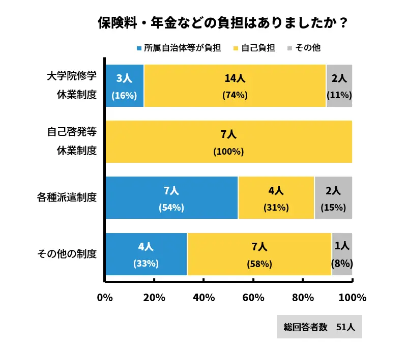 利用した制度によって、修学中の金銭面でのサポートの有無や充実度合いに大きな差が見られた。全体的な傾向として、金銭的なサポートは各種派遣制度・その他(長期研修制度など)、大学院修学休業制度、自己啓発等休業制度の順に充実しており、同じ「大学院での修学」という状況であっても、利用した制度が派遣・研修か休業かによって金銭面での負担が大きく異なる実情が窺えた。