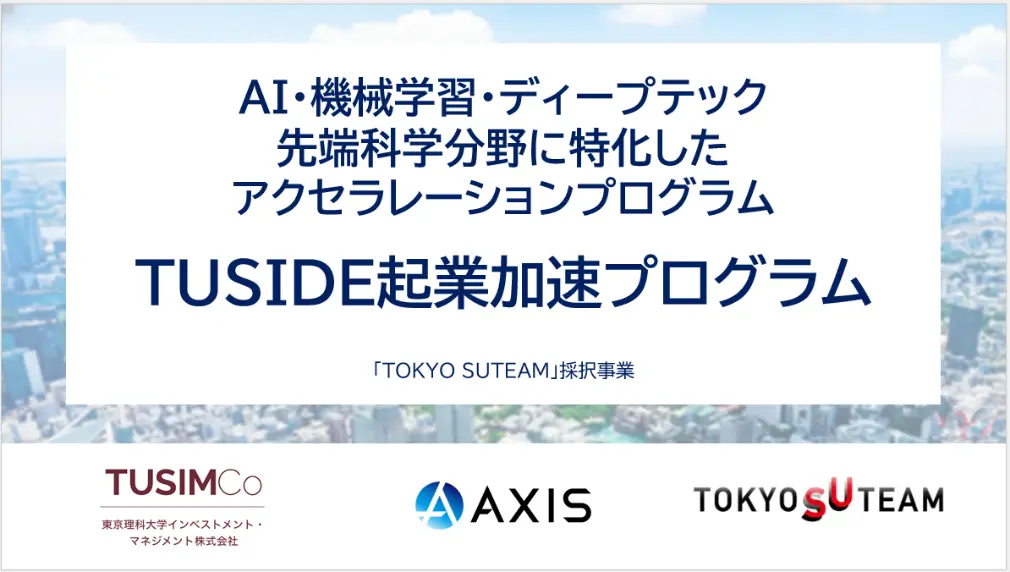 アクシスコンサルティングは22日、東京理科大学インベストメント・マネジメントと連携し、東京都のスタートアップ支援事業「TOKYO SUTEAM」で採択された先端科学分野特化のアクセラレーションプログラム「TUSIDE起業加速プログラム(TUSIDE EAP)」を実施すると発表した。