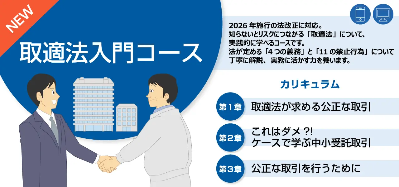 2026年1月施行の「中小受託取引適正化法(通称:取適法)」に対応し、法改正で拡大する適用対象や取引ルールを、具体事例を通じて短時間で学べる内容だという。