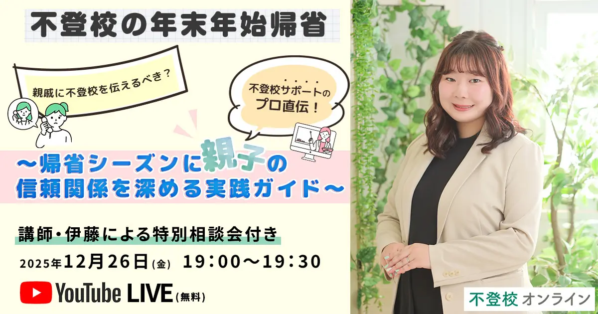 テーマは「“不登校の年末年始帰省” 親戚に不登校を伝えるべき?不登校サポートのプロ直伝!~帰省シーズンに親子の信頼関係を深める実践ガイド~」。不登校支援歴15年以上、延べ卒業生1.4万人を超える実績を持つ、同塾で教室長を務めた伊藤真依氏が講師を務める。