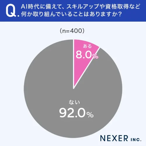 また、AI時代に備えて、スキルアップや資格取得に「取り組んでいる」と答えた割合は8%にとどまり、意識と行動のギャップが大きい。