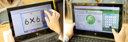 今回の授業は、小学2年生の“九九(6〜8の段)”の習得を目的とした個人・ペア学習の活動。子どもたちは、協働学習支援ツール「オクリンクプラス」で九九表を見ながら声に出したり、AIドリル「ドリルパーク」に取り組んだりと、自分に合った方法で学習を進めていった。