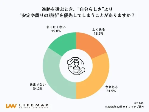 「進路を選ぶとき、“自分らしさ”より“安定や周囲の期待”を優先してしまうことがあるか?」と聞いたところ、50.0%の高校生が「よくある」「ややある」と回答。内訳は、「よくある」が18.5%、「ややある」が31.5%だった。進路選択という将来に直結する場面では、日常生活とは異なり、自分らしさよりも安定性や周囲からの期待を意識した判断が優先されやすい実態が伺える。