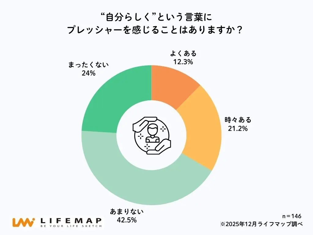 一方、「“自分らしく”という言葉にプレッシャーを感じることはあるか?」と尋ねたところ、33.5%の高校生が「よくある」「時々ある」と回答。内訳は、「よくある」が12.3%、「時々ある」が21.2%だった。「あまりない」は42.5%、「まったくない」は24.0%で、全体ではプレッシャーを感じていない層が多数を占めたが、約3人に1人がこの言葉に対して負担を感じていることも明らかになった。