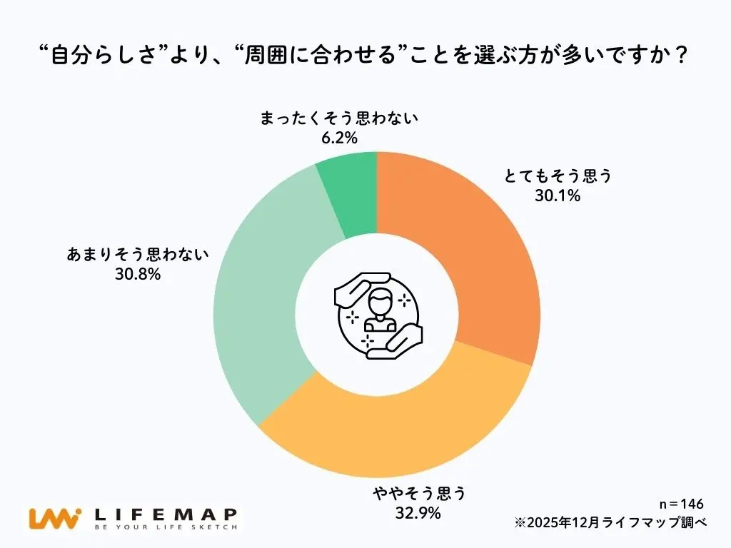 「“自分らしさ”より、“周囲に合わせる”ことを選ぶ方が多いか?」との質問では、63.0%の高校生が「とてもそう思う」「ややそう思う」と回答。内訳は、「とてもそう思う」が30.1%、「ややそう思う」が32.9%で、自分らしさよりも周囲との関係性を優先する場面が少なくないことが伺える。