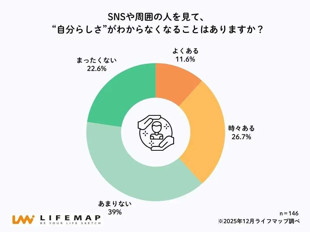 また、「SNSや周囲の人を見て、“自分らしさ”が分からなくなることはあるか?」と聞いたところ、約4割(38.3%)が「よくある」「時々ある」と回答。日常的に他者の考えや価値観に触れる中で、自分の考えに迷いを感じる高校生が一定数いることが分かった。