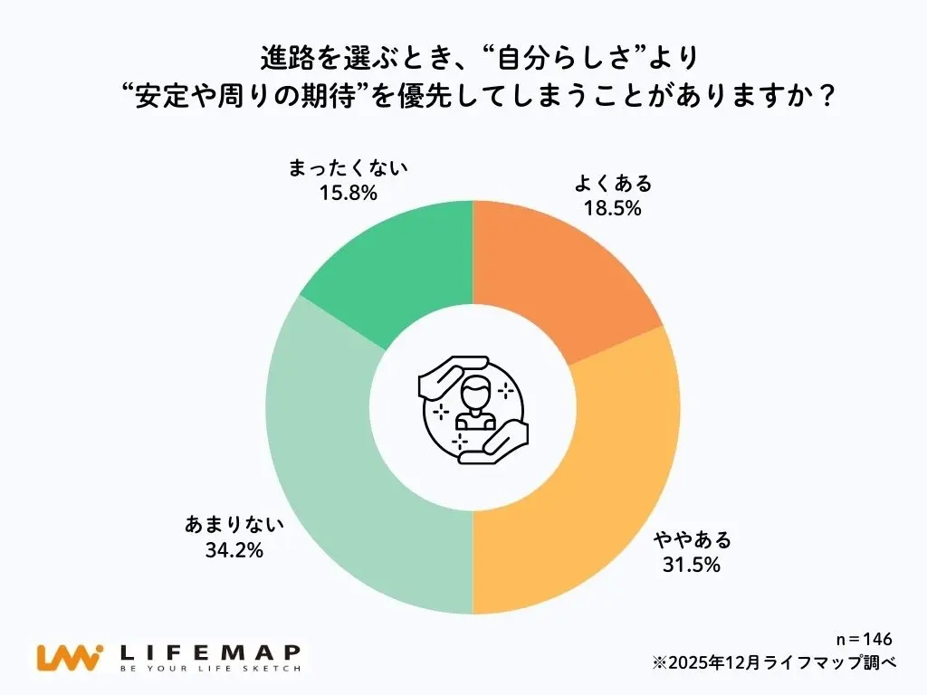「進路を選ぶとき、“自分らしさ”より“安定や周囲の期待”を優先してしまうことがあるか?」と聞いたところ、50.0%の高校生が「よくある」「ややある」と回答。内訳は、「よくある」が18.5%、「ややある」が31.5%だった。進路選択という将来に直結する場面では、日常生活とは異なり、自分らしさよりも安定性や周囲からの期待を意識した判断が優先されやすい実態が伺える。