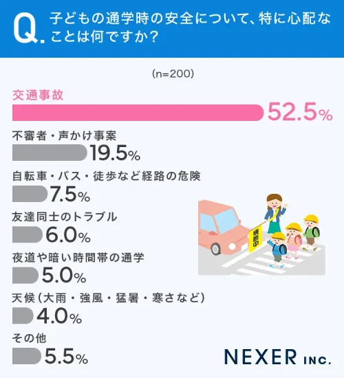 子どもの通学時の不安、保護者の52.5%が「交通事故」と回答=NEXER調べ=