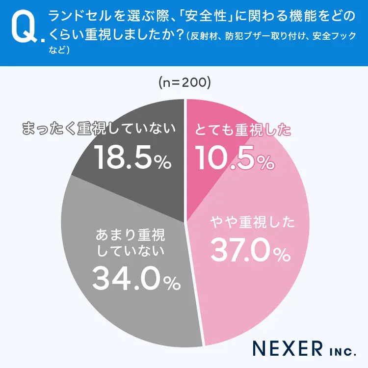 続いて、ランドセルを選ぶ際、「安全性」に関わる機能をどのくらい重視したか?、を聞いたところ、「とても重視した」が10.5%、「やや重視した」が37.0%で、合わせて47.5%の保護者が安全機能を意識してランドセルを選んでいることが分かった。一方「あまり重視していない」34.0%、「まったく重視していない」18.5%と、安全機能よりもほかの要素を優先した保護者も一定数いた。