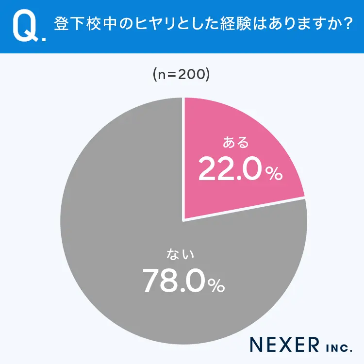 また、「登下校中にヒヤリとした経験はあるか?」と尋ねたところ、「ある」が22%、「ない」が78%という結果になり、約5人に1人がヒヤリとした経験を持っていることが分かった。ヒヤリとした経験の多くは交通関連のもので、車やバイクとの接触危機、側溝への転落など、日常の通学路には意外な危険が潜んでいるのが分かる。一方、不審者情報のメールを受け取ったというエピソードもあり、保護者の緊張感が伺える。