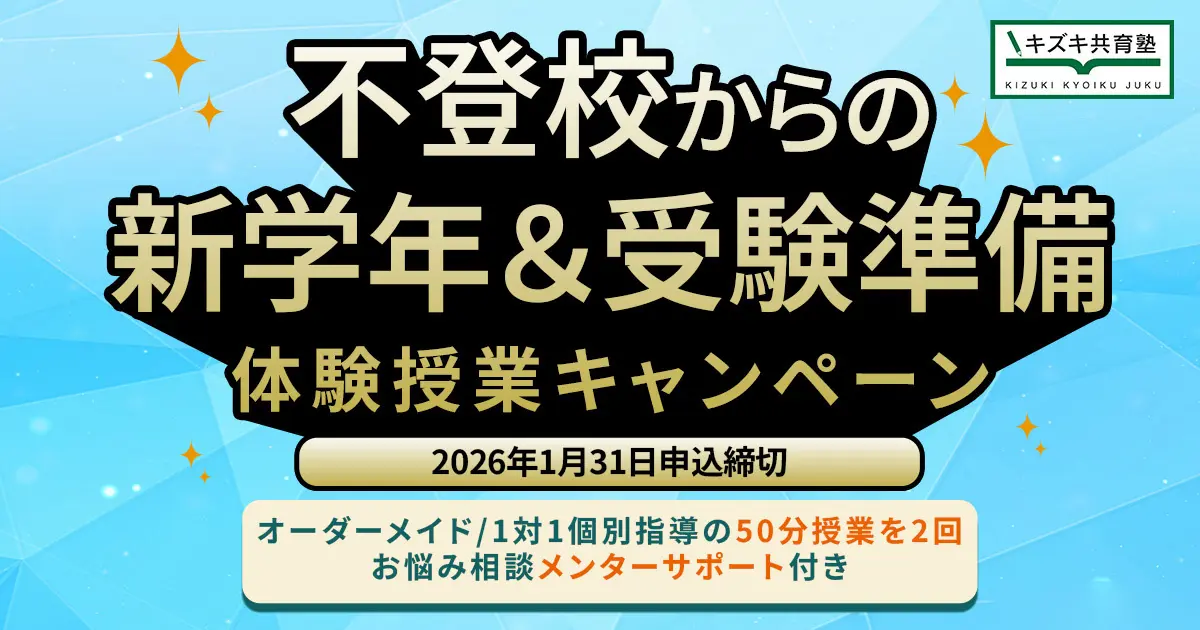 キズキが運営する完全個別指導塾「キズキ共育塾」は、不登校や学習の中断を経験した子ども・若者を対象に、「新学年&受験準備・体験授業キャンペーン」を1月末まで実施する。