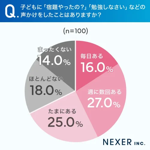 子どもが家で勉強せずに過ごしている場面で、保護者が「宿題やったの?」「勉強しなさい」といった声かけをした経験があるかを尋ねたところ、「毎日ある」16%、「週に数回ある」27%、「たまにある」25%で、計68%が「声かけをしたことがある」と回答した。一方で「あまりない」「まったくない」は計32%だった。