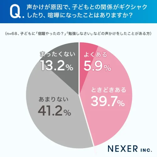 一方、声かけをしたことがある保護者に「声かけが原因で親子関係がギクシャクしたり喧嘩になったことがあるか」を聞くと、「よくある」5.9%、「ときどきある」39.7%で、約46%がトラブル経験ありと回答した。きっかけとして多かったのは、子ども側の「今やろうと思ってたのに」「言われるとやりたくなくなる」といった反発で、保護者側も反抗的態度にいら立ち、強い言い方になって言い合いに発展するケースが見られた。