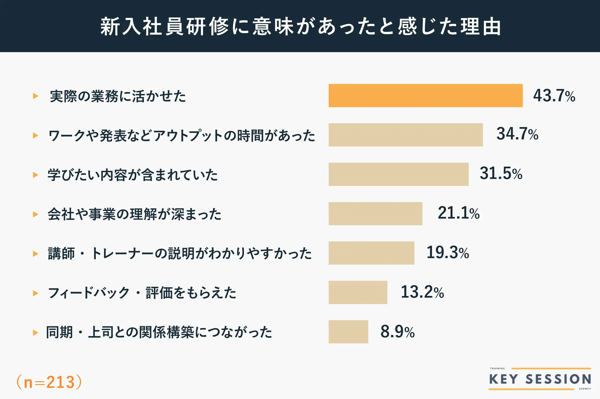 「非常に意味があった」「まあまあ意味があった」と回答した人に理由を尋ねたところ、「実際の業務に活かせた」が最多の43.7%となった。次点で「ワークや発表などアウトプットの時間があった」が34.7%、「学びたい内容が含まれていた」が31.5%となった。